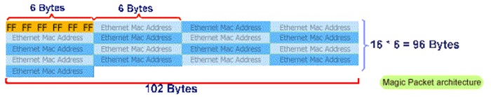 The magic packet is a broadcast frame containing anywhere within its payload 6 bytes of all 255 (FF FF FF FF FF FF in hexadecimal),followed by sixteen repetitions of the target computer’s 48-bit MAC address.Since the magic packet is only scanned for the string above and not actually parsed by a full protocol stack,it may be sent as any network and transport layer protocol,although it is typically sent as a UDP datagram to port 7 or 9,or directly over Ethernet.